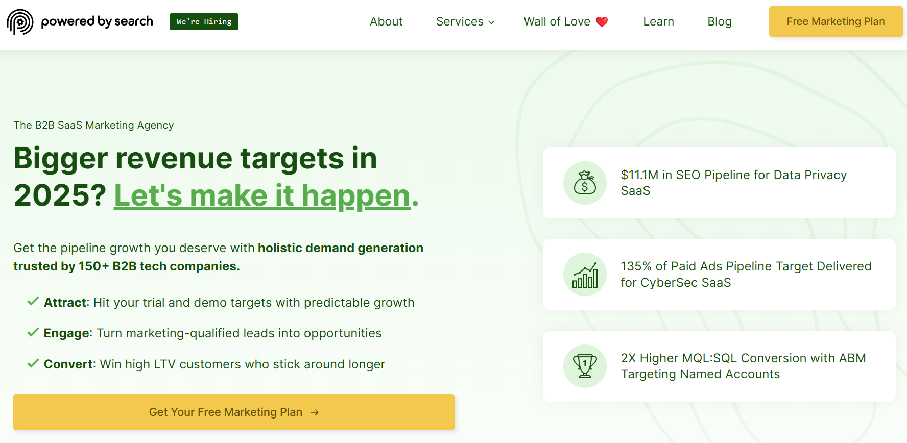 | Powered by Search | Established SaaS & tech | Demand gen, content marketing, SEO, paid search (PPC), ABM, PR, link building | Varonis, Collibra, TouchBistro (also VMware, Fortra) |
