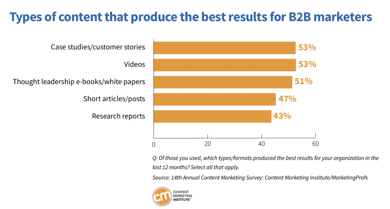 Some of the popular B2B content types include blogs, social media posts, videos, podcasts, emails, white papers, and case studies. The findings from the CMI survey in 2024 suggest that case studies or customer stories and videos produced some of the best results for B2B marketers.