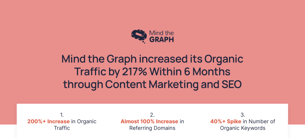 Part of the reason is that it’s a budget-friendly channel. Sure, there are labor costs to consider, and maybe some budget for content tools. But compared to hefty investments in advertising or events, B2B content marketing keeps costs in check. Moreover, content has a lasting impact, delivering value for months or even years after publication.Our client, Mind the Graph is living proof that well-executed and SEO-driven content marketing and distribution works! 200% increase in organic traffic gave them more qualified traffic within six months.
