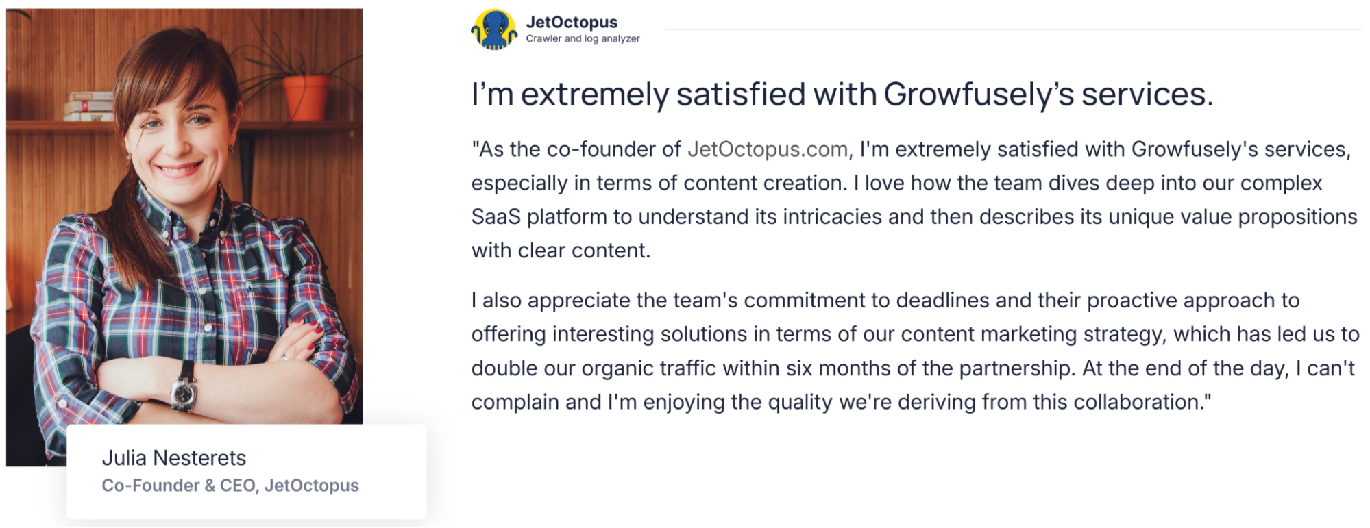 Some standout results include increasing Mind the Graph’s organic traffic by 217% within six months through B2B SEO and doubling JetOctopus’s organic traffic within ten months through content marketing.