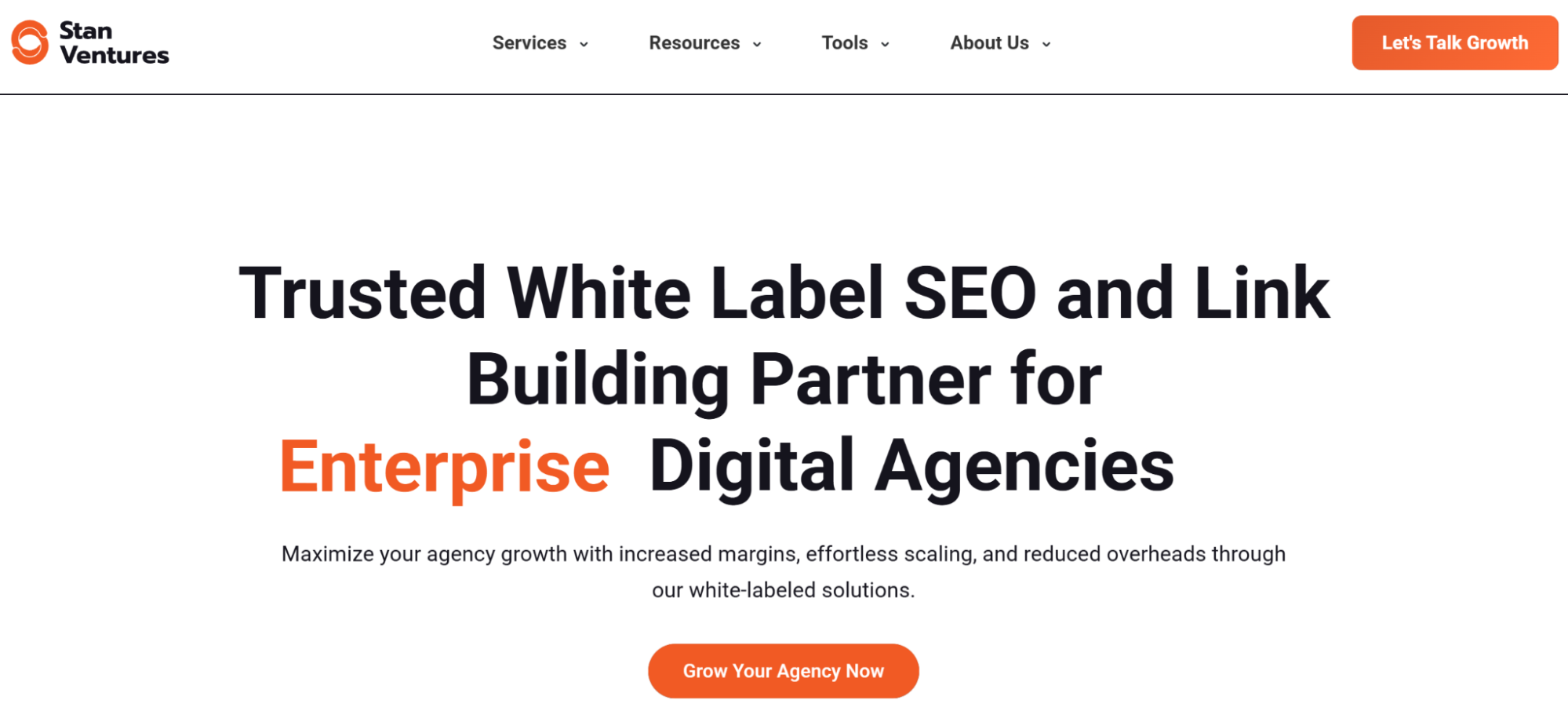 | Stan Ventures | Agencies and businesses looking for scalable SEO | White label SEO, link building, guest posting, on-page optimization, local SEO | SEO consulting, Verano, Neptune’s Daughter, Wise Pelican |