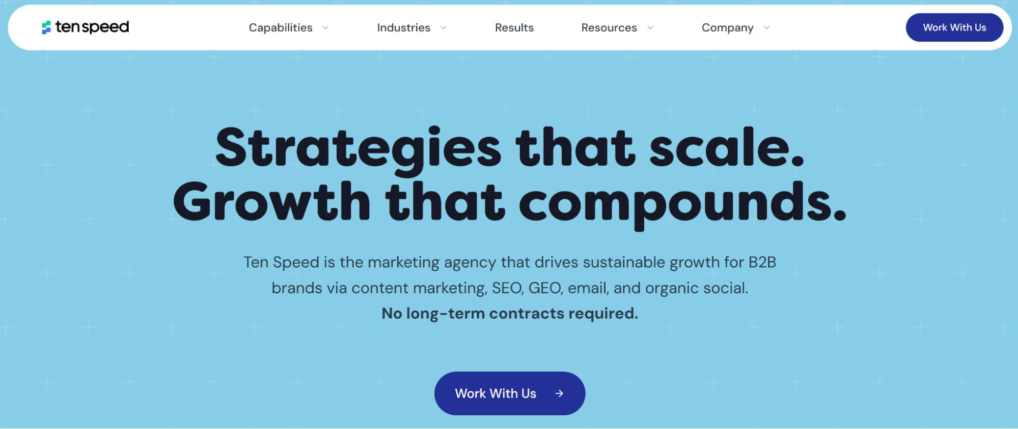 Ten Speed is essentially an SEO agency for B2B SaaS, specializing in boosting growth and performance for its clients through organic strategies.