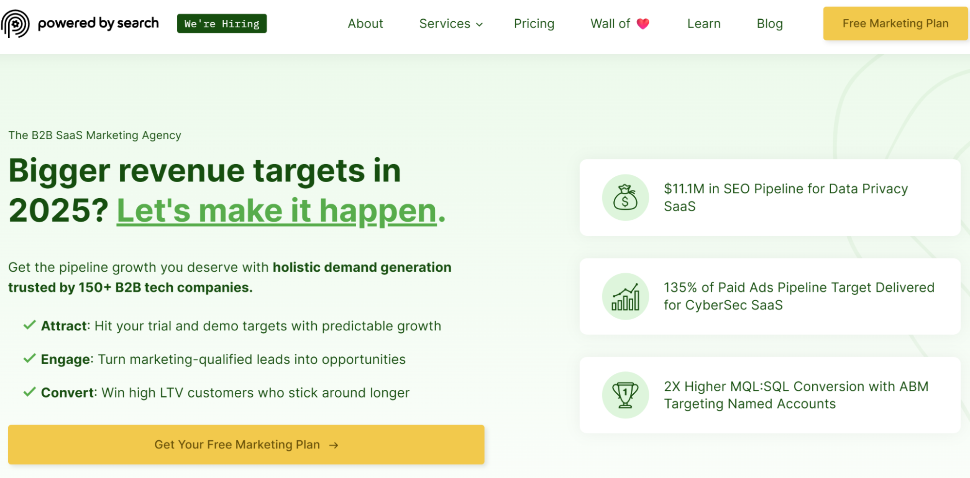 | Powered by Search | B2B SaaS & tech companies needing full-service growth | Paid ads, SEO, content marketing, demand gen, digital PR, link building | Rally, Podia, Remote |