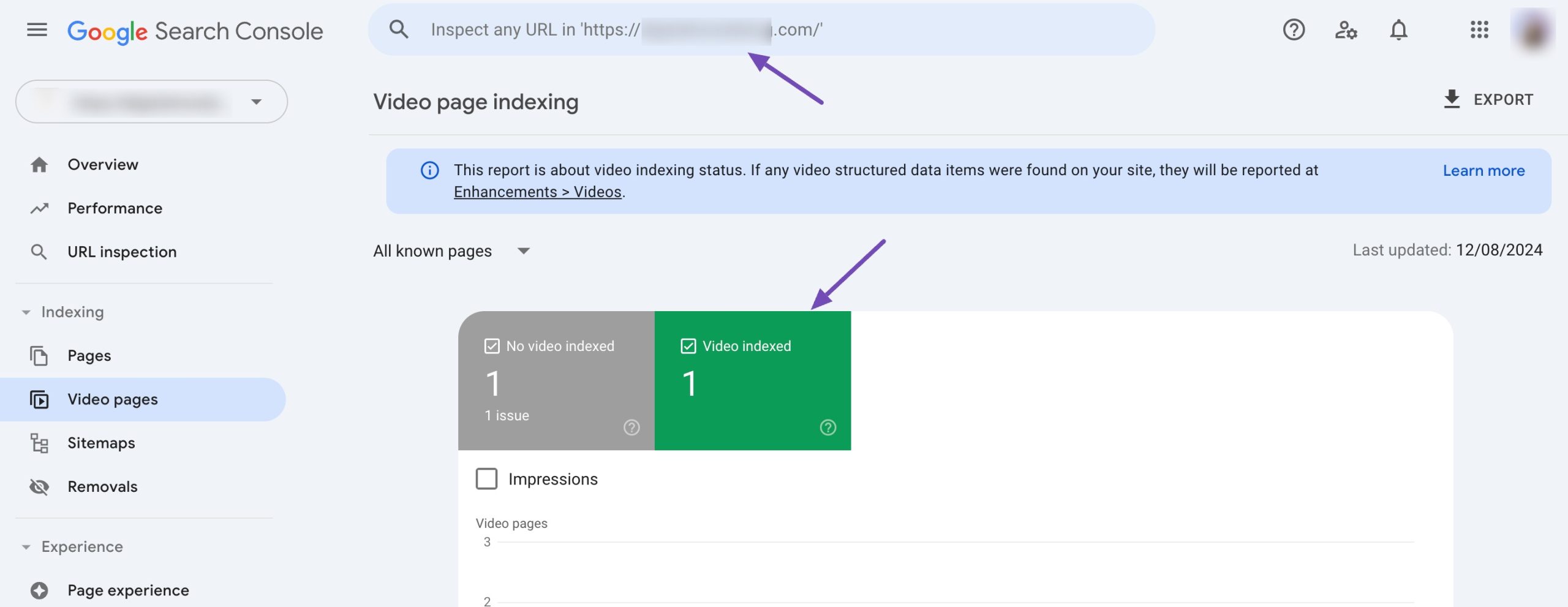 Use Google Search Console to check if the video page is indexed. Once the video is uploaded on a channel like YouTube, enter the URL into the URL Inspection tool.