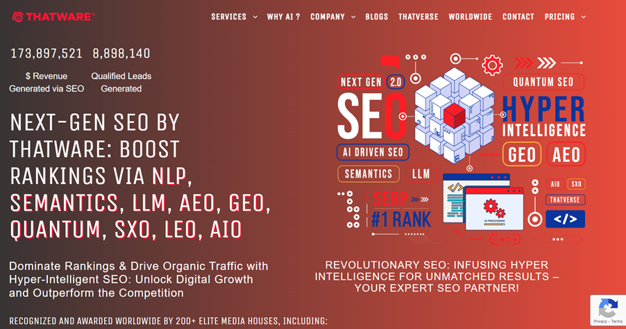 ThatWare is a newer agency pushing the edge of SEO with AI, data, and experimental methods. They call their approach “Hyper Intelligence SEO,” blending semantic AI, intent prediction, and advanced analytics.