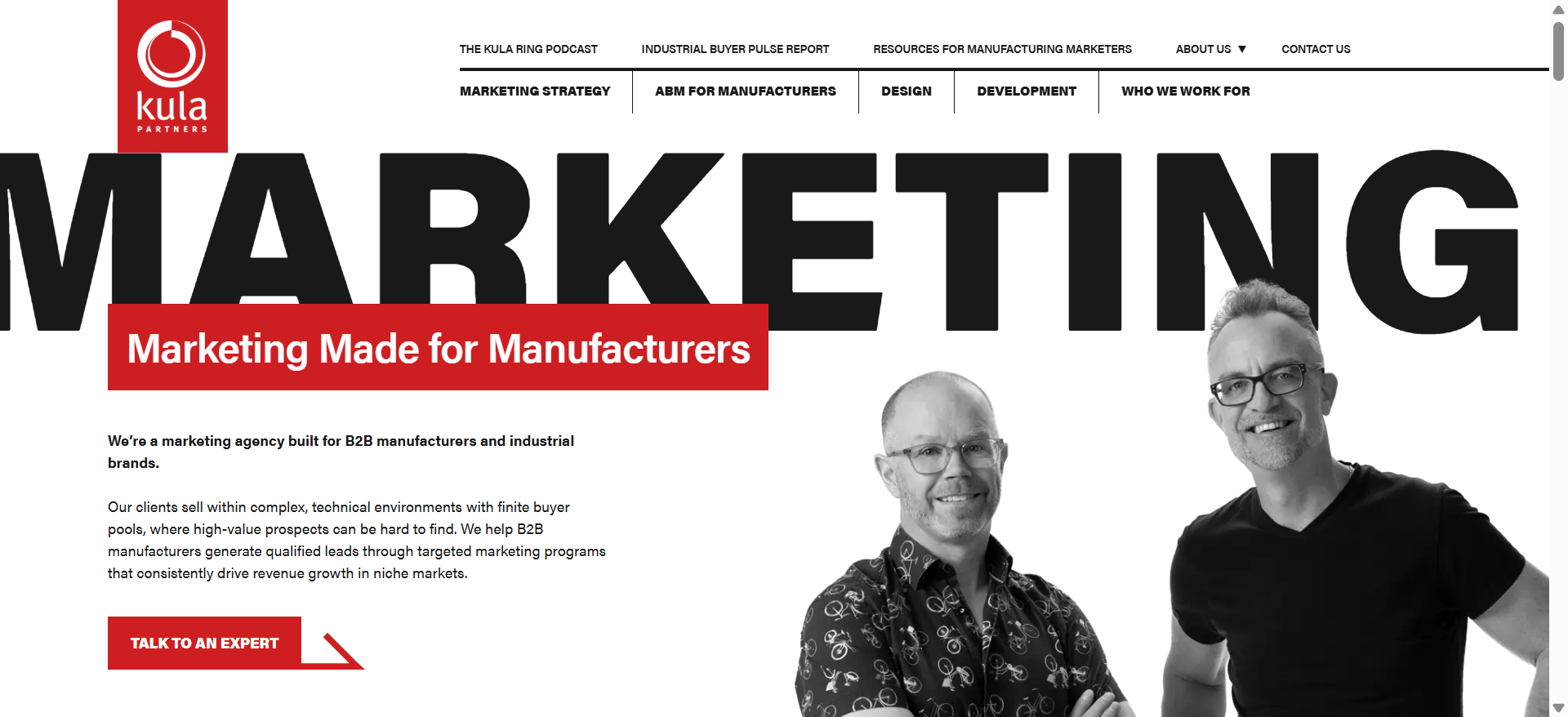 Kula Partners Manufacturers of complex or technical products who seek to enhance their marketing strategies Marketing strategy development, goal setting and measurement, account-based marketing (ABM), web design and development Abloy, ATS, Bridgestone, Daikin, Omron, Emmerson Packaging, Dahl, C-Therm