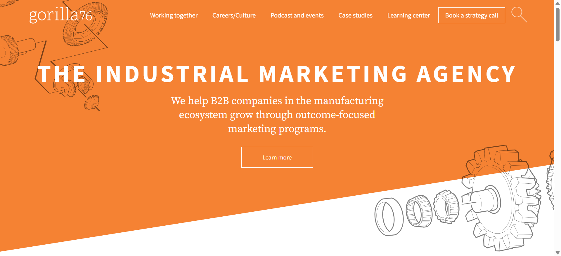 Gorilla 76 Midsized B2B manufacturing organizations selling customized solutions Revenue-focused marketing campaigns, content strategy/development, website optimization, lead generation/nurturing, sales enablement Davron Technologies, Multi-Tek, CK Power, Green Dot Bioplastics, US Coatings, Subsurface Constructors Inc.