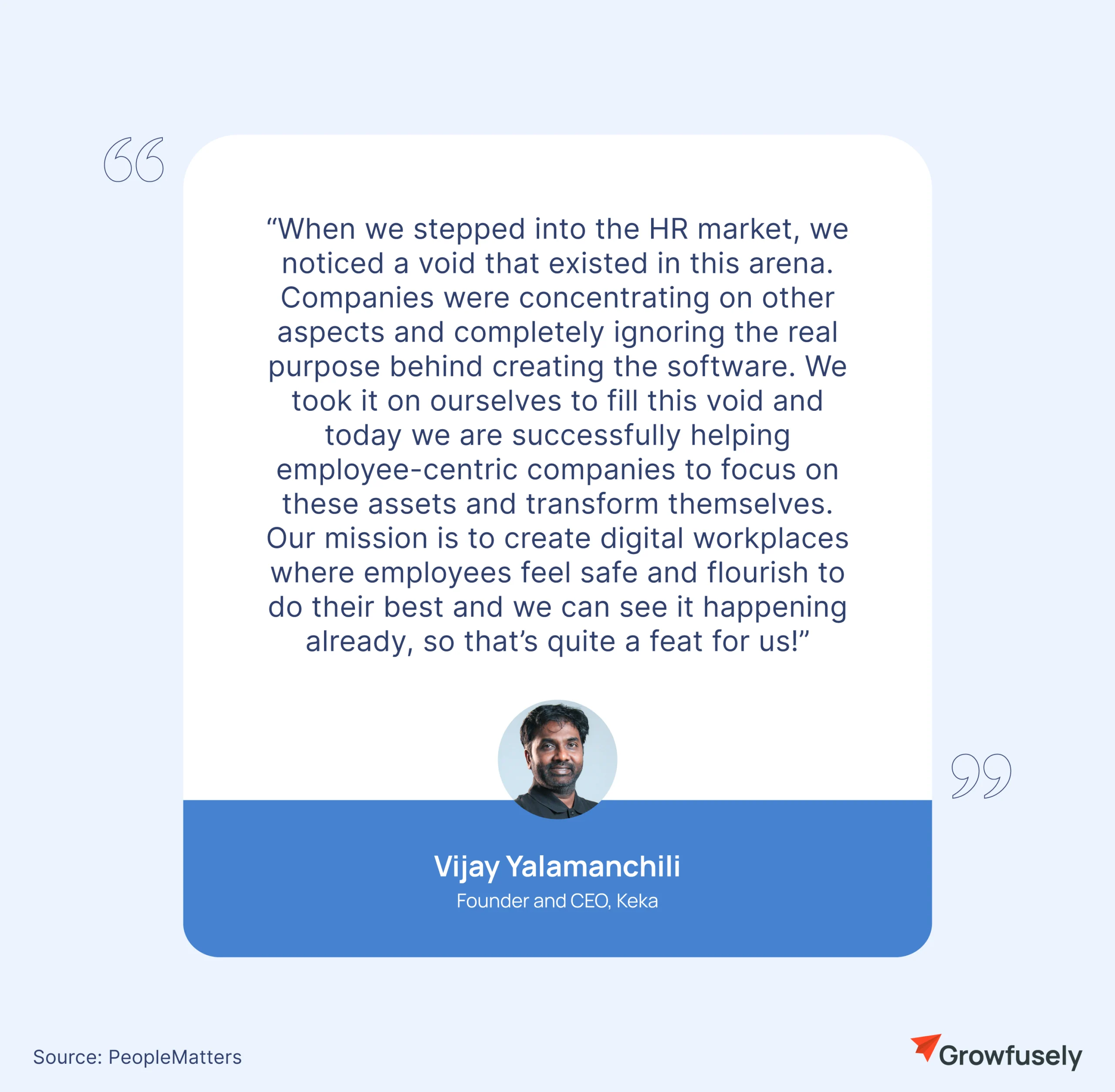 And that was it. Before he knew it, Vijay was already busy growing his software services business while looking for the right HR solution to support them. The glaring gap inspired him to build his own software, Keka, a tool meant to help HR practitioners focus on their key assets, i.e., employees.