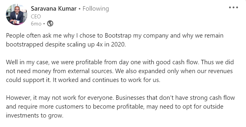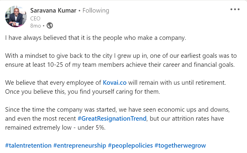 A focus on LinkedIn has also helped Kovai.co increase its following from 17,000 to 96,000 on the platform. The company continues to engage with its followers and has also revamped its “Life @ Kovai” page. It prefers to recruit through this professional social media platform, too.