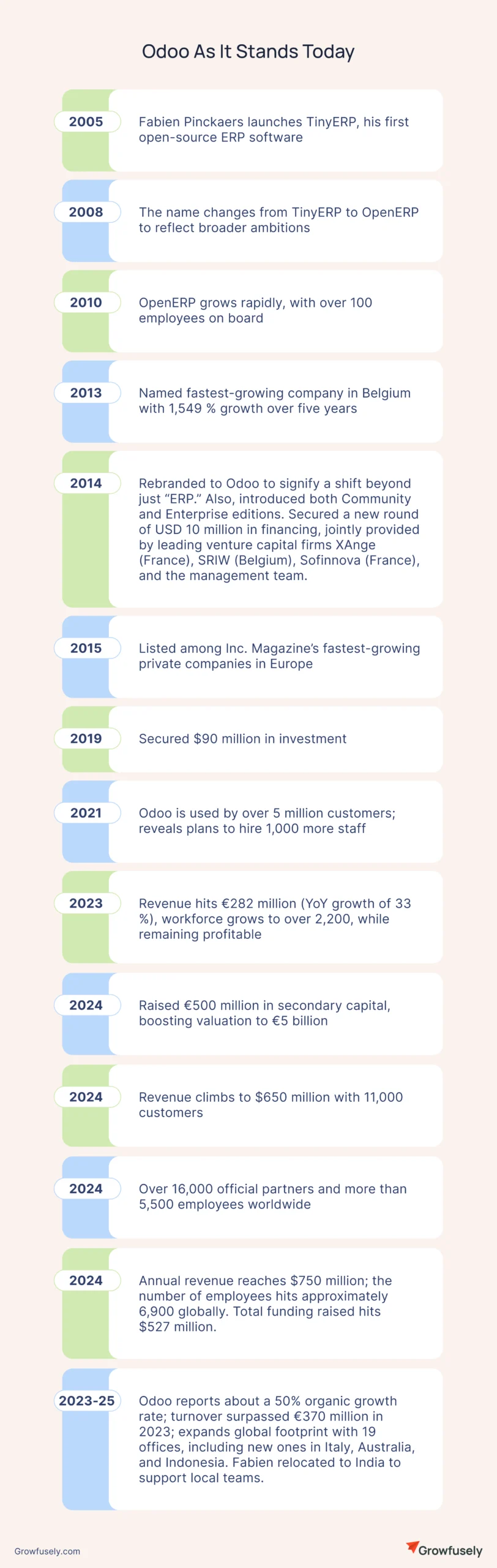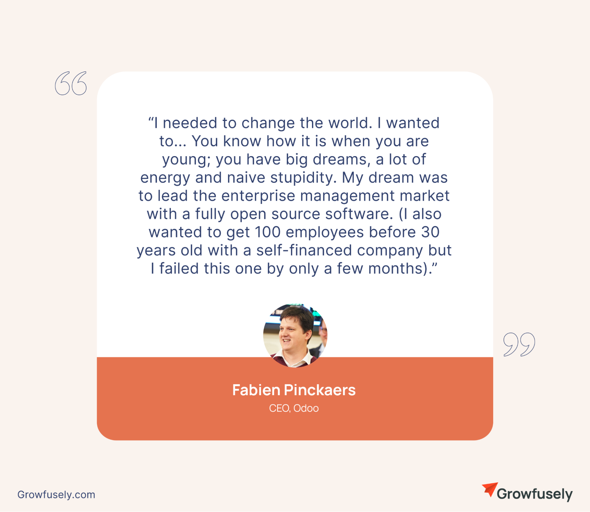 Fabien Pinckaers’ journey is proof that staying focused on what really matters can help entrepreneurs achieve more than they dreamed of. He went from starting TinyERP to building a worldwide platform used by millions. As such, Odoo’s success came from staying close to the product, trusting the team, and protecting the company’s culture.