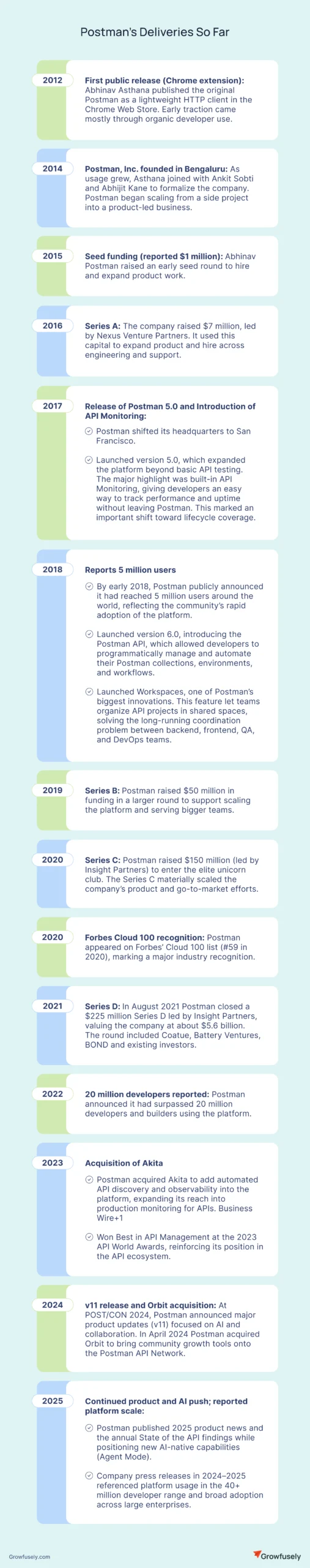 Let’s look at the timeline of Postman’s key milestones and recognitions, from its first release to major funding, user growth, product moves, acquisitions, and awards.