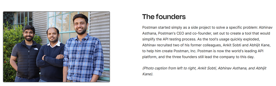He built a lightweight tool, shared it for free, and to his surprise, people showed up; in tens of thousands. Soon, Abhinav brought in two former colleagues, Ankit Sobti and Abhijit Kane, to turn the project into a full company: Postman, Inc. Together they aimed for something simple: make APIs easy to build, test, collaborate on.