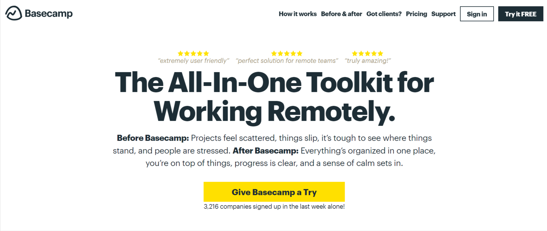 Basecamp is the all-in-one project management kit to handle remote work. With Basecamp, companies can break up their entire work into separate projects. This tool keeps track of all discussions, files, documents, tasks, and more.
