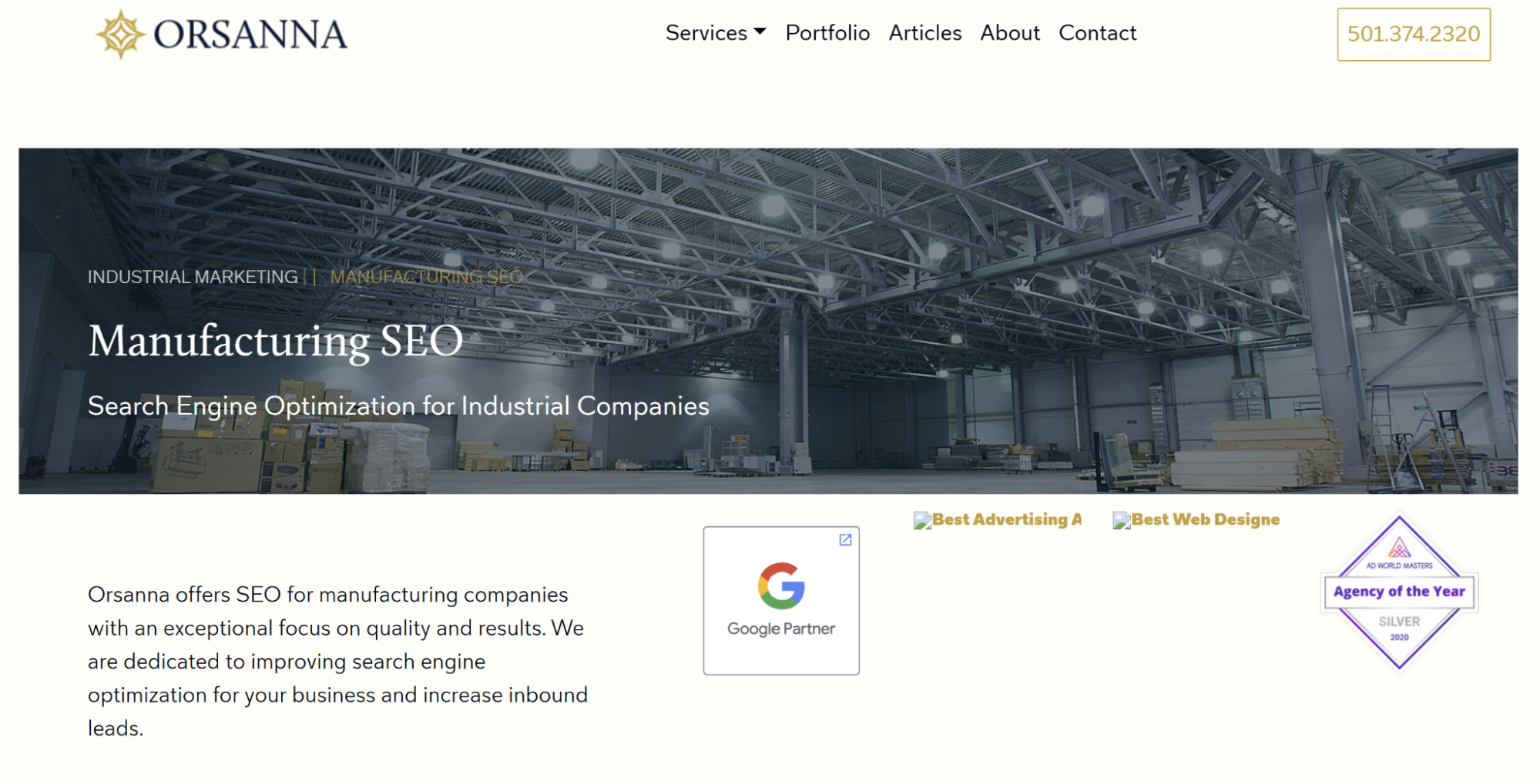 Orsanna is an Arkansas-based industrial marketing agency offering SEO services aimed at manufacturers and industrial companies. Their work focuses on improving rankings, inbound lead flow, and organic visibility through SEO and content marketing tailored to industrial buyers.
